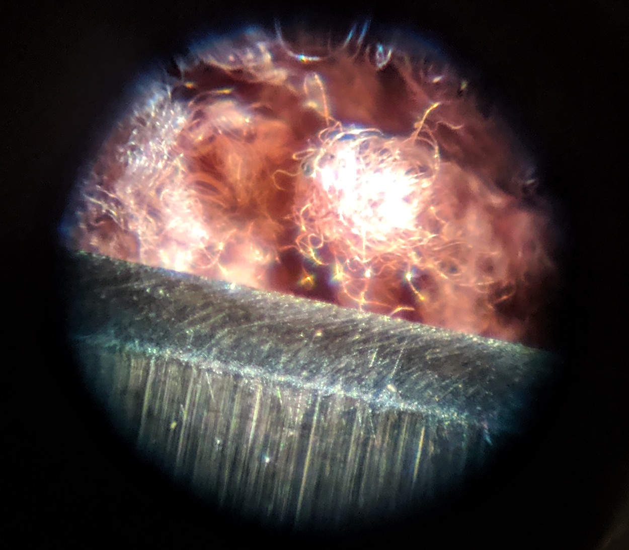 For example, the picture below is a microscopic view of a knife-edge that I have sharpened. For size comparison, the cloth the knife is on is a red microfibre cleaning cloth.